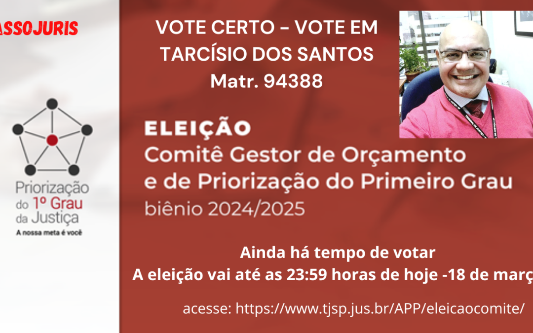 Participe dessa Eleição Vote Certo – Vote em Tarcísio dos Santos – matr. 94388 Acesse: https://www.tjsp.jus.br/APP/eleicaocomite/Login.aspx?ReturnUrl=%2fAPP%2feleicaocomite%2fEleicoes%2fVotacao%2fDefault.aspx