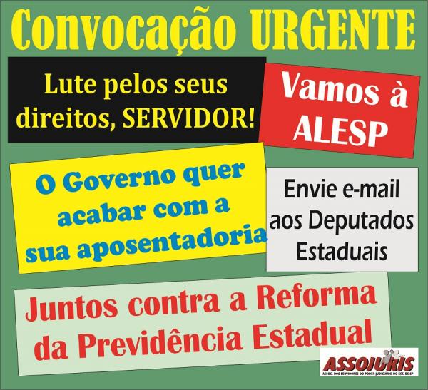 É de fundamental importância que os servidores permaneçam mobilizados realizando gestões junto aos deputados, enviando e-mails aos parlamentares para a não aprovação desta nefasta reforma (Clique aqui), além de ficarem de sobreaviso para a ida à ALESP, principalmente os da grande São Paulo e região.