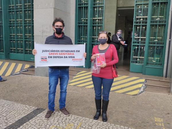 A ASSOJURIS, nas pessoas de Joara Borges, diretora no Litoral Norte e o representante da entidade na Capital Paulista, André Santos, estiveram em frente ao Fórum João Mendes, nesta quarta-feira (29), oportunidade em que orientaram os servidores que retornaram às atividades presenciais quanto a greve sanitária, além de distribuirem panfletos sobre o tema, também participaram do ato o Sinjuris, Sindjesp, Sintrajus, Assojubs, AASPTJ e Assetj.