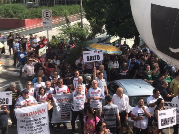 Em conjunto com outras classes do servidorismo, entidades do Judiciário estiveram presentes em manifestação unificada realizada em frente a Assembleia Legislativa de São Paulo contra a pretendida Reforma da Previdência Estadual.