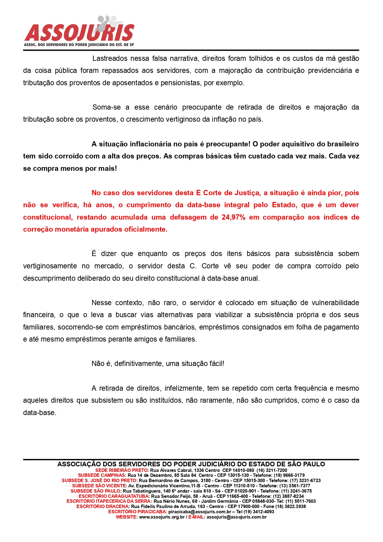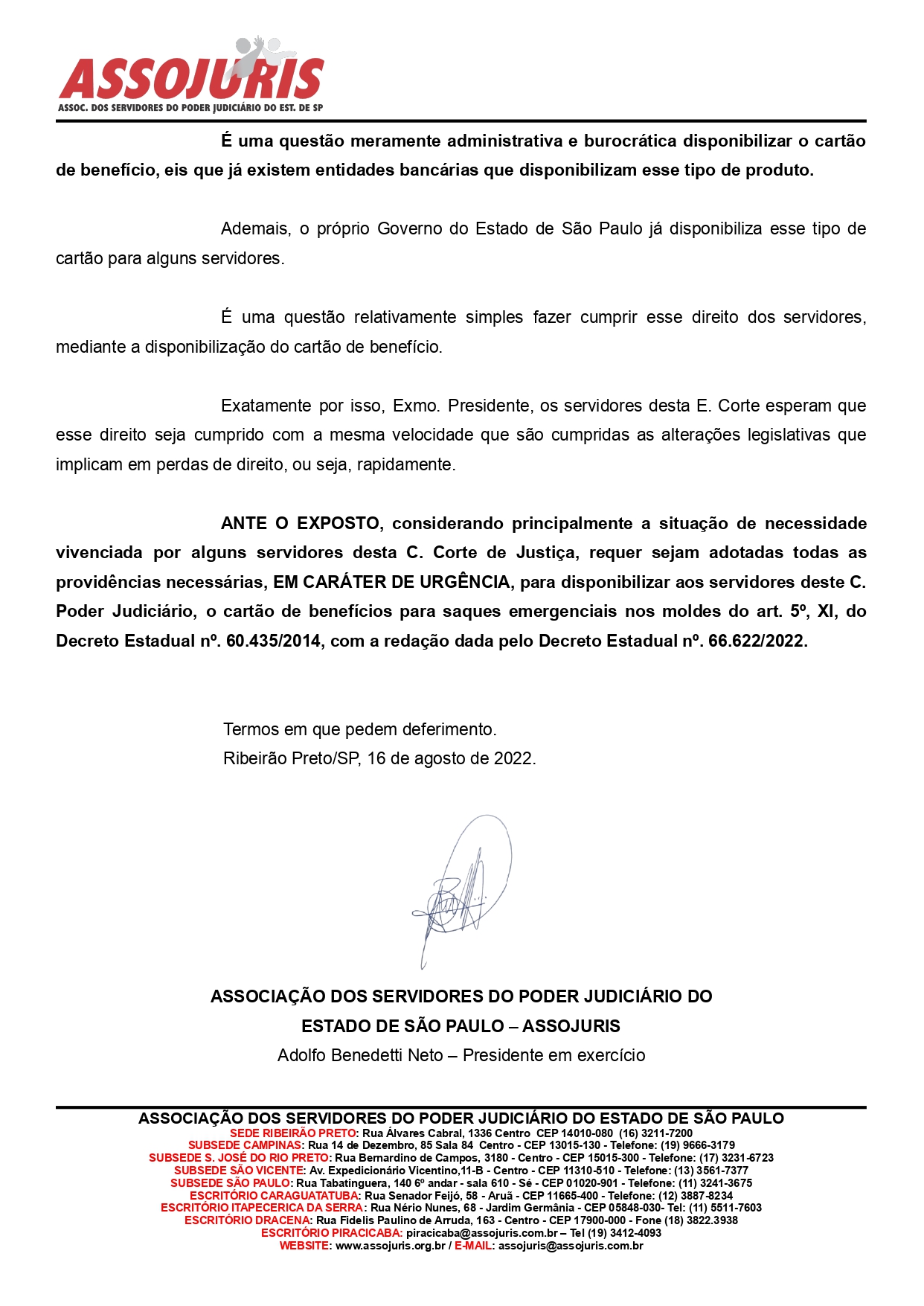 Diante dessa omissão do TJ/SP e da inflação que assola o país, a ASSOJURIS, sempre zelando pela defesa dos direitos dos servidores do poder judiciário paulista, encaminhou requerimento o Presidente do Tribunal, Desembargador Ricardo Mair Anafe solicitando, em caráter de urgência, a disponibilização do cartão de benefício.
