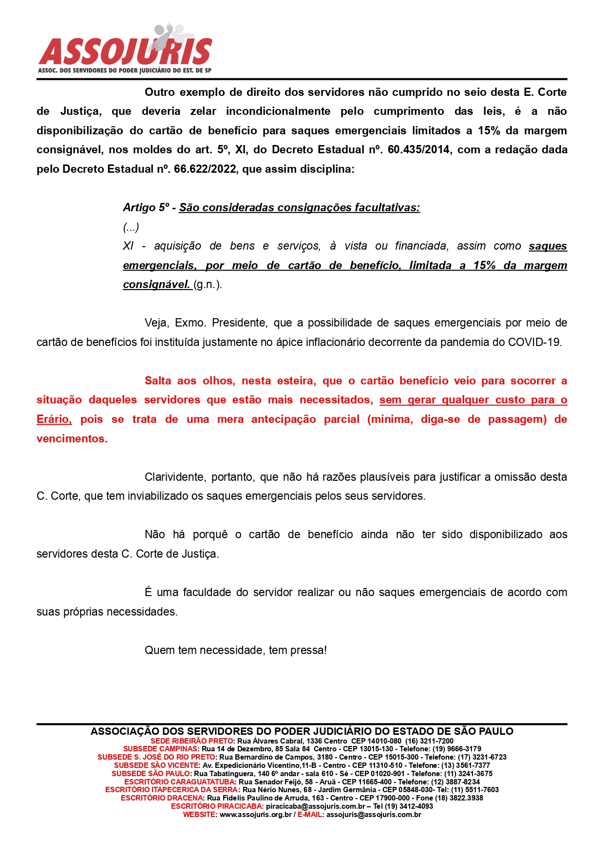 “O direito do servidor é inegociável. Se a legislação assegura um instrumento para realização de saques emergenciais em caso de necessidade, o Tribunal deve viabilizar o exercício do direito de escolha do servidor. A situação financeira do país não está fácil. A inflação atingiu níveis preocupantes e o servidor não teve a sua recomposição salarial como impõe a Constituição Federal, então pode ser que o servidor precise antecipar parte dos seus vencimentos e Tribunal não pode inviabilizar o saque emergencial. Por isso, fizemos o pedido e esperamos que o cartão de benefício seja disponibilizado o quanto antes“, considerou o Presidente em exercício da ASSOJURIS, Adolfo Benedetti Neto, o Pardal.