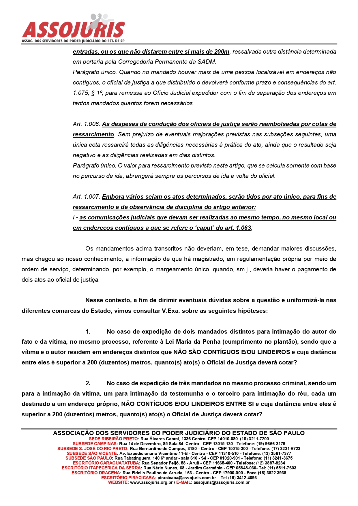 A ASSOJURIS, por meio de seu departamento Jurídico, escritório Navarro de Albuquerque, oficiou ao Corregedor Geral de Justiça do Tribunal de Justiça do Estado de São Paulo, Desembargador Fernando Antônio Torres Garcia, com o objetivo de esclarecer e sanar questões no que tange a sistemática de pagamento de atos aos oficiais de justiça nos moldes do Art. 1.063 c/c art. 1.007, I, das NSCGJ.