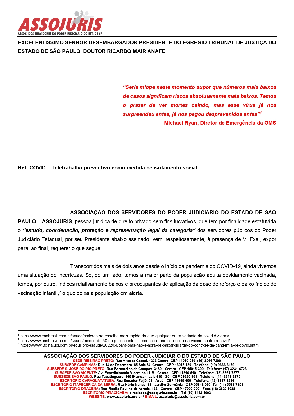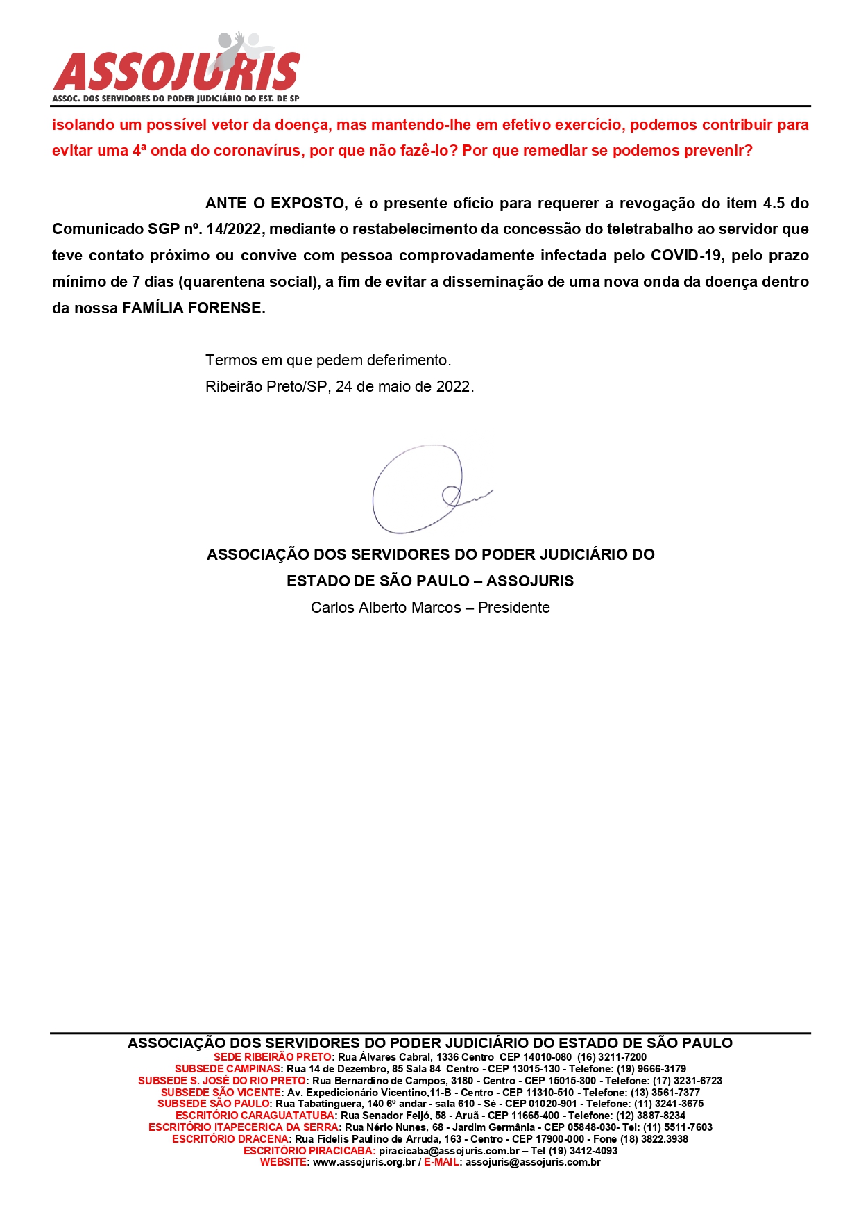 A pandemia não acabou! Não podemos descuidar! Manter o isolamento social temporário de quem teve contato ou mora com uma pessoa infectada é uma medida de amor e respeito ao próximo. É melhor conceder o teletrabalho, mantendo a produtividade do servidor em home office, do que assistir uma nova onda de contaminação em massa dentro do tribunal, colocando em risco a vida e a saúde da família forense, e prejudicando a prestação jurisdicional. Não vemos razão para que o nosso pleito não seja prontamente atendido”, asseverou Alemão da ASSOJURIS, presidente da entidade.