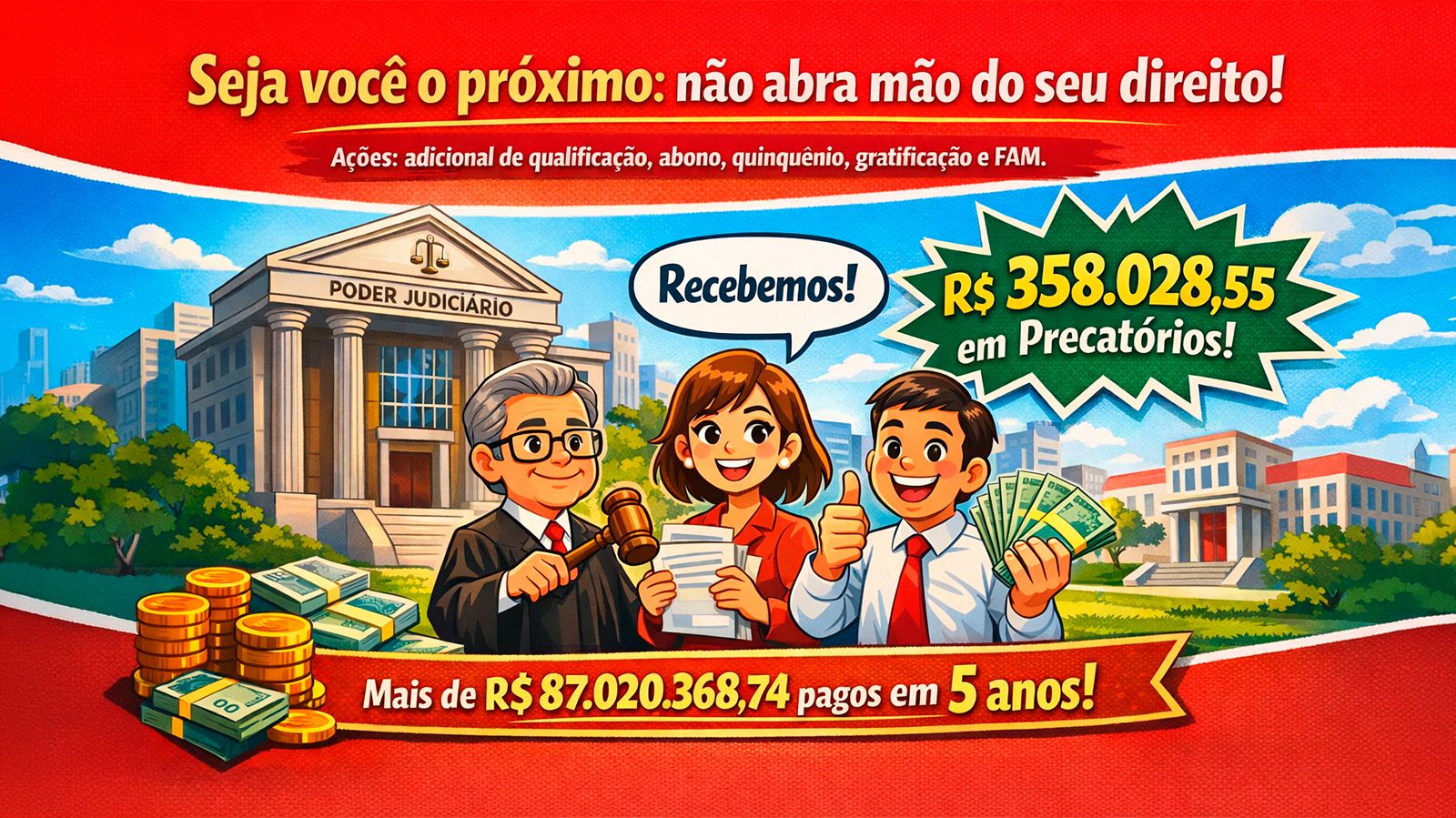 Esse valor, somado as quantias pagas nos últimos 5 (cinco) anos apenas aos filiados a entidade perfaz o total de R$ 87.020.368,74 (Oitenta e sete milhões, vinte mil, trezentos e sessenta e oito reais e setenta e quatro centavos). Seja você o próximo!  Não abra mão do seu direito!