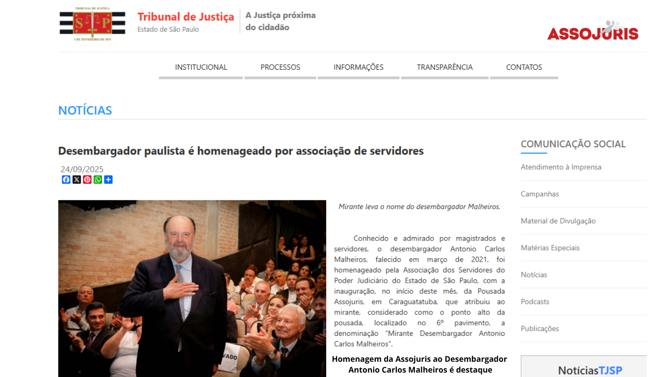 Homenagem da Assojuris ao Desembargador Antonio Carlos Malheiros é destaque