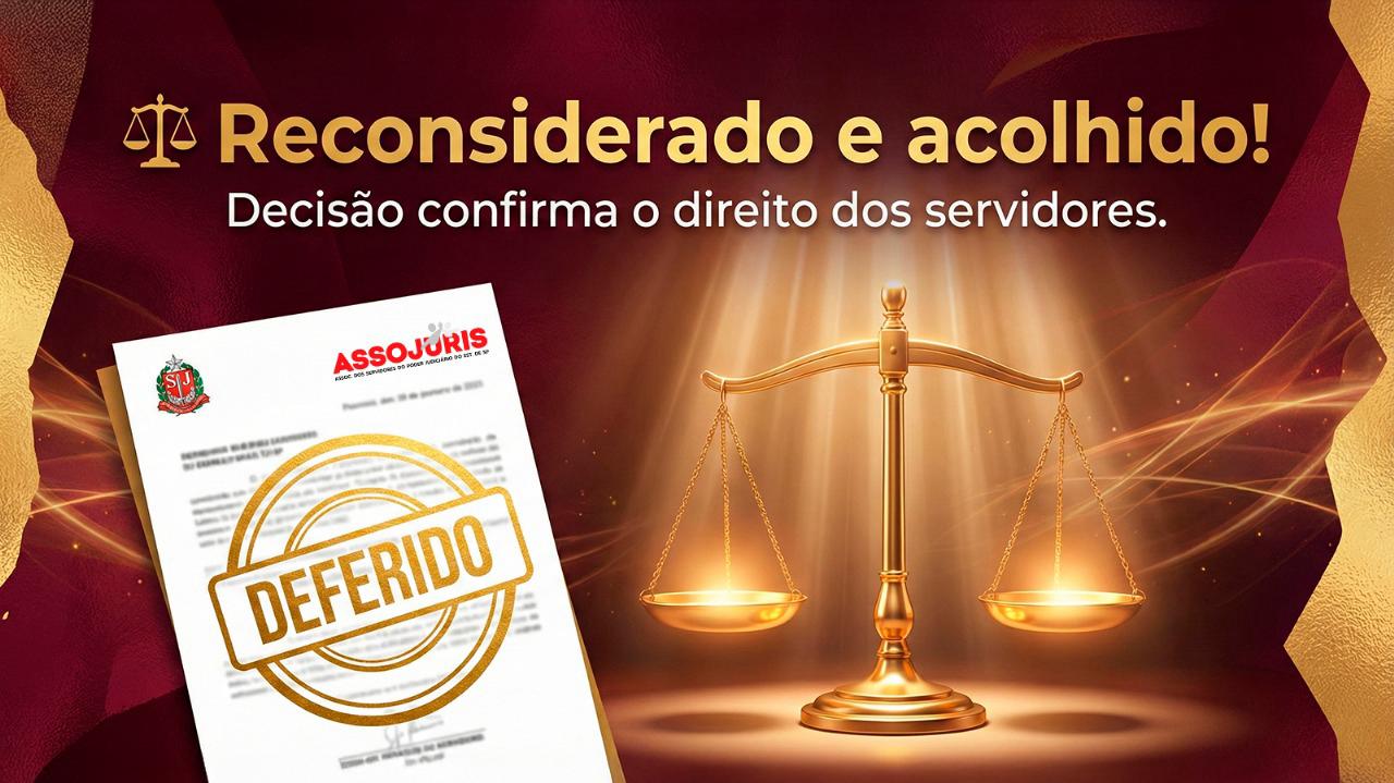 – No último dia 02.12.2025, a Presidência do TJ/SP, representada, mais uma vez, pelo Exmo. Dr. Wagner Roby Gidaro e também pelo Dr. André Gustavo Cividanes Furlan, juízes assessores, decidiu pelo acolhimento do pedido de reconsideração da ASSOJURIS, determinando que sejam acolhidas, também, a opção dos servidores que, ainda que constem na lista de associados da ação coletiva, escolheram pela incidência da contribuição previdenciária somente sobre os vencimentos do cargo efetivo acrescidos das verbas já incorporadas.