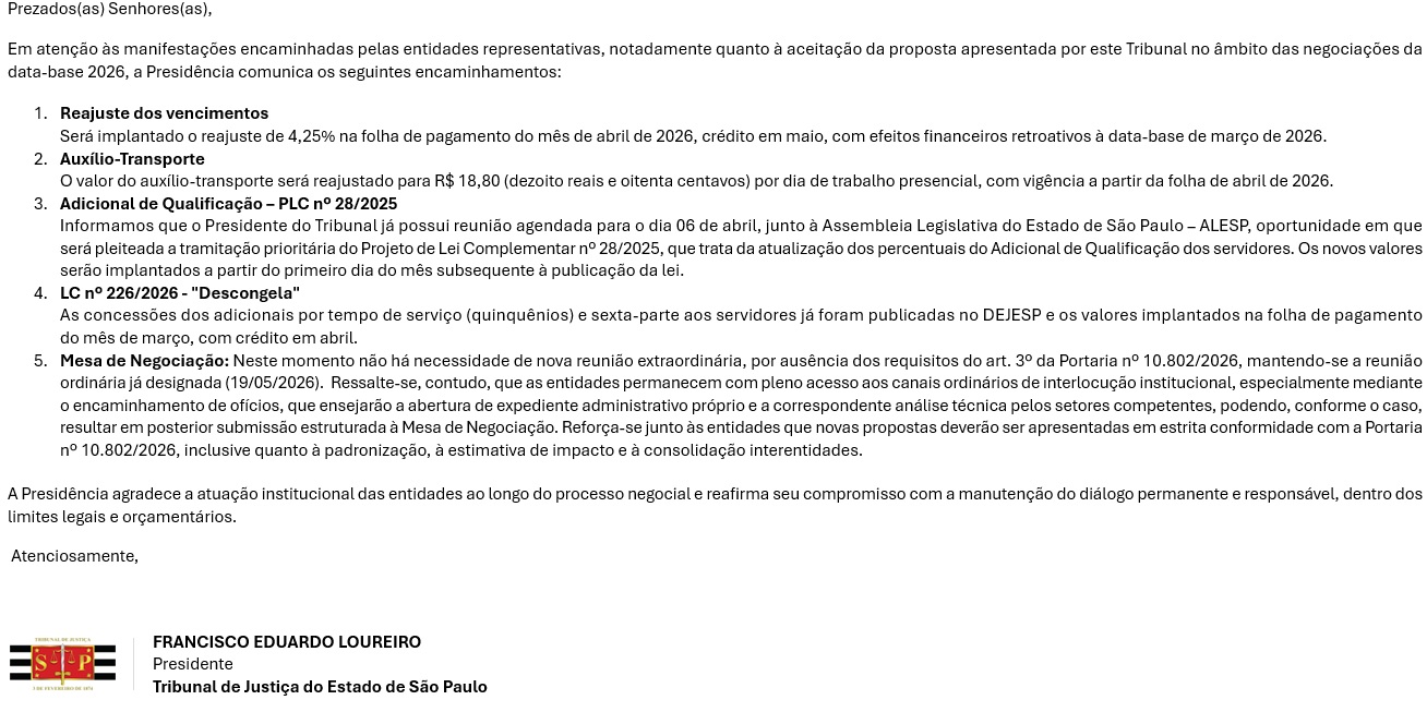 Na tarde desta segunda-feira, após resposta de aceitação da categoria, sem prejuízo a novas discussões, a presidência do Tribunal de Justiça do Estado de São Paulo, desembargador Francisco Eduardo Loureiro, concede data base de 4,25%, frente a uma inflação de 3,36% nos últimos doze meses, retroativa a 1º de março, para recebimento no quarto dia útil da folha do mês de maio; o auxílio-transporte passou de R$14,00 para R$18,80, por dia de trabalho