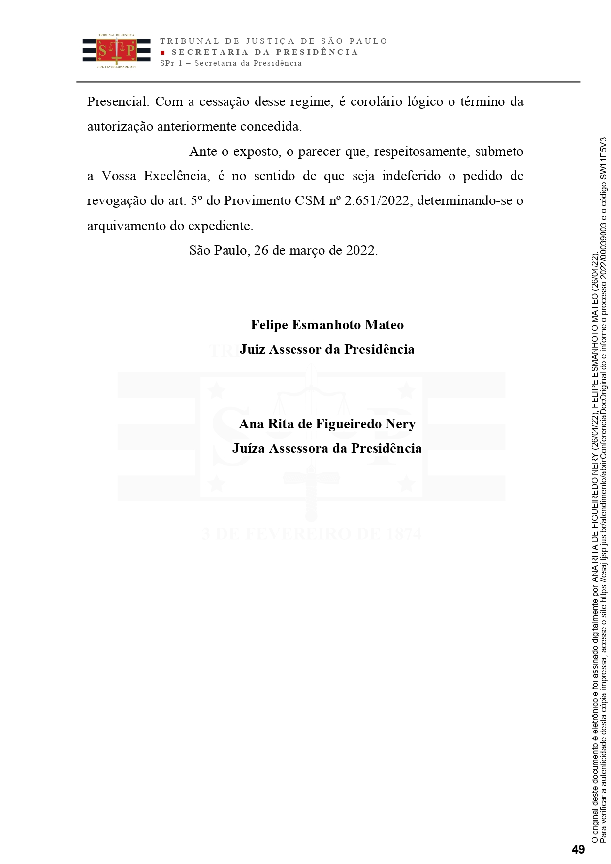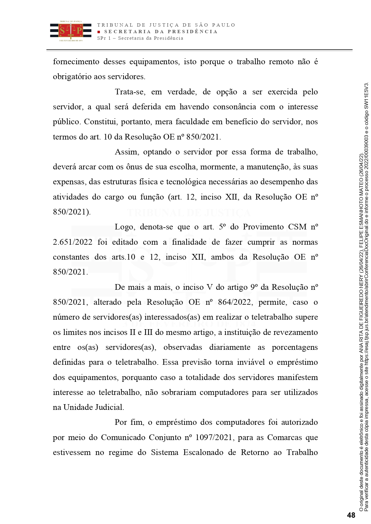 Em resposta ao requerimento protocolado no dia 2 de abril de 2022, pela Associação dos Servidores do Poder Judiciário do Estado de São Paulo, através do qual solicitou a revogação da determinação de devolução dos equipamentos de informática por aqueles servidores que permaneceram em teletrabalho (artigo 5º do Provimento CSM nº. 2651/2022), a Corte Paulista, através do Ofício nº 033/2022, anuncia decisão que indefere o pedido.
